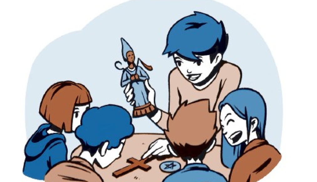 Aujourd’hui, Mlle Pervenche est de retour dans la classe de Mme Pétronille pour un nouveau cours d’éthique et cultures religieuses. Elle demande aux élèves de se rassembler autour del a grande table du fond de la classe. Elley dépose une grande boîte en carton et en sort divers objets: une étoile à six branches en métal, une petite croix en bois, un foulard sur lequel est imprimé un croissant de lune, quelques statuettes égyptiennes, grecques… Les élèves sont très curieux. Rapidement, ils reconnaissent des symboles religieux. «Les enfants, aujourd’hui, nous allons parler des différents symboles de quelques religions.» Certains ouvrent de grands yeux, tandis que d’autres sont plus en retrait et manifestent la crainte de devoir parler de ces objets ou de les manipuler. «Ça, je connais, dit alors Alfred. C’est une croix protestante.– Mais non, c’est une croix catholique, n’est-ce pas, maîtresse? répond alors Luigi.– Il s’agit bien d’une croix. Elle peut être catholique ou protestante. En revanche, si le corps de Jésus figure sur la croix, on parlera alors de crucifix, et celui-ci n’est utilisé que par les catholiques.– Pourquoi? – Eh bien, les protestants veulent avant tout se remémorer grâce à la croix vide la résurrection de Jésus, tandis que les catholiques accordent plus d’importance à la Passion, c’est-à-dire la souffrance de Jésus sur la croix, qui est également un symbole important. Les enfants, aujourd’hui, nous allons aborder les points communs et des différences entre les confessions d’une même religion,et entre des religions différentes.» Quelques minutes plus tard, la maîtresse explique que certains personnages de la Bible apparaissent dans d’autres traditions que la religion chrétienne, par exemple Marie, la mère de Jésus, qui porte le nom de Maryam dans la religion musulmane.