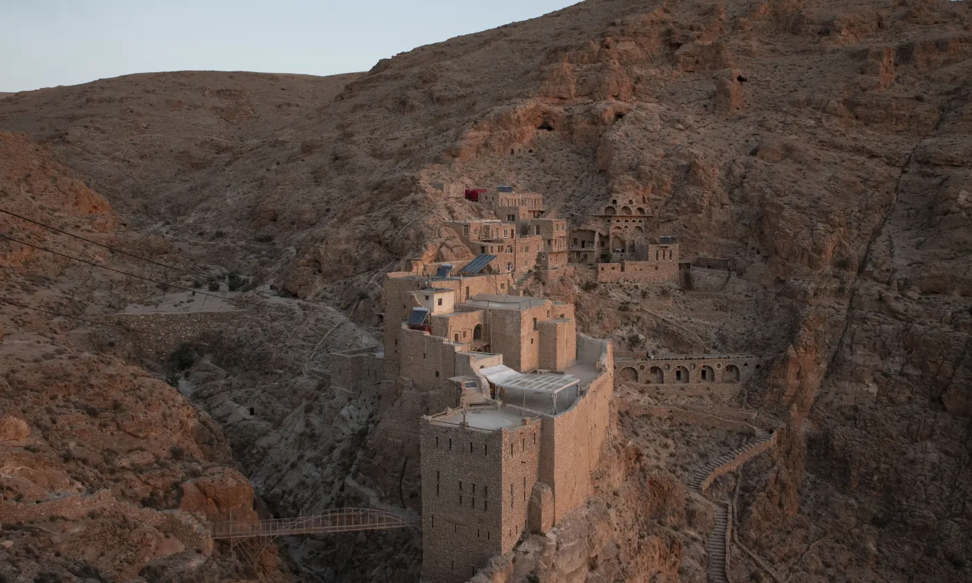 Perché à 1320 mètres d'altitude dans la chaîne montagneuse de l'Anti-Liban, le monastère syriaque catholique de Deir Mar Musa al-Habachi (ou monastère de Saint Moïse l'Abyssin) abrite la communauté al-Khalil de Mar Moussa. Mixte et œcuménique, cette communauté a été fondée en 1991 par le père jésuite italien Paolo Dall'Oglio et est actuellement dirigée par l'abbé Jihad Youssef. Mars 2025.